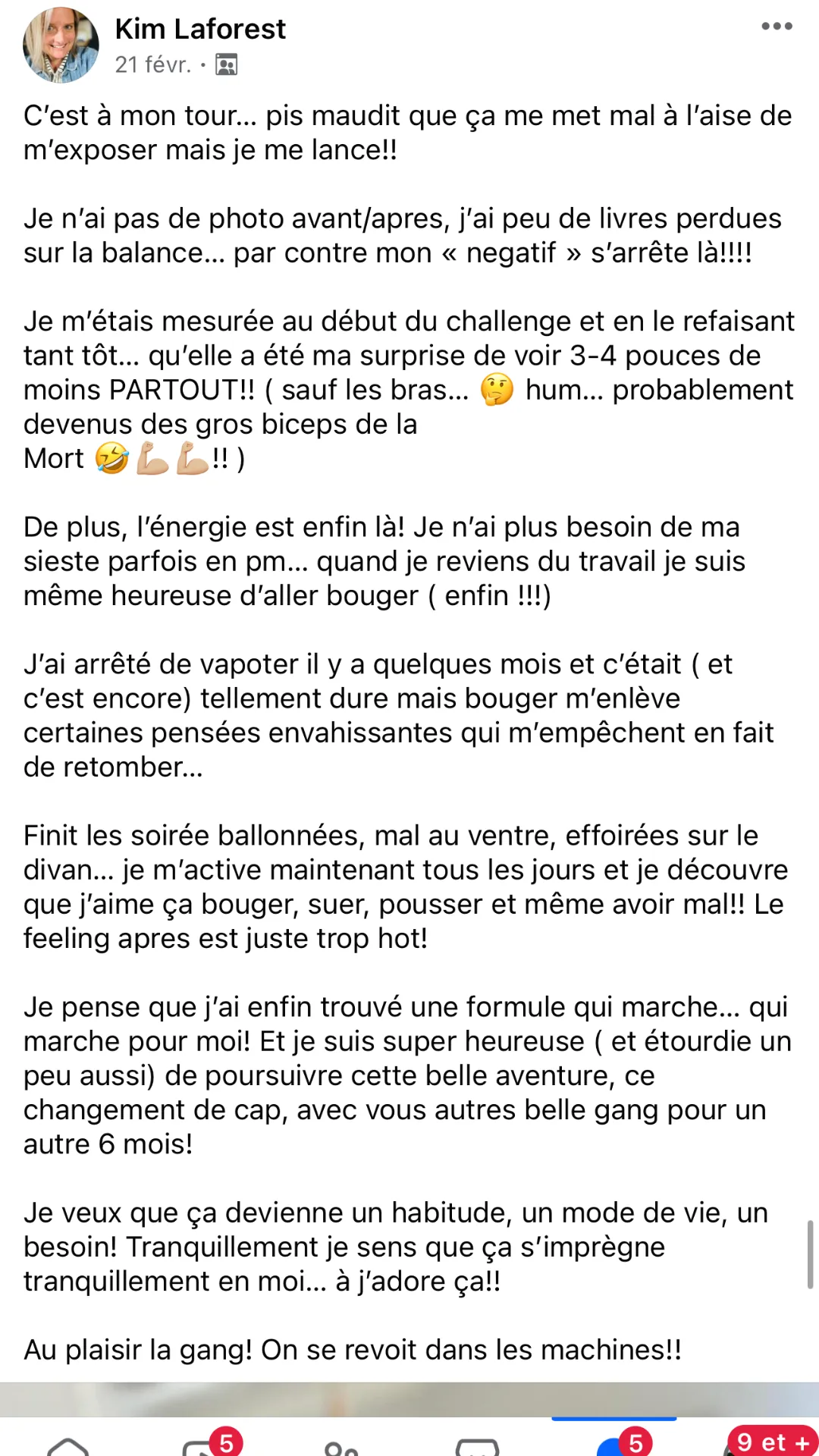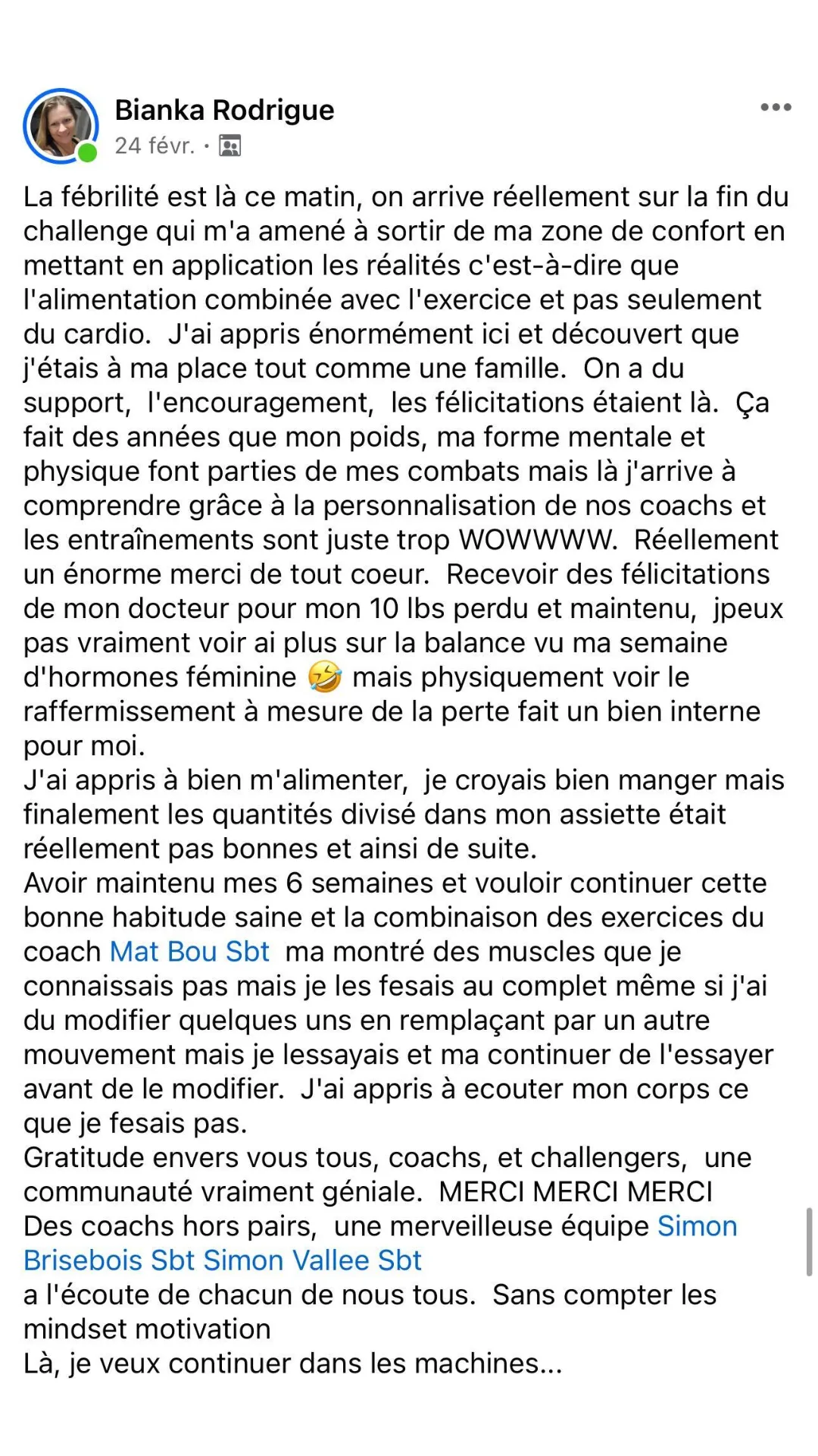 Et c’est là que j’ai eu le déclic: pourquoi je n’accompagnerais pas des personnes dans le même processus? Après des formations pour être entraîneur, un triathlon, un demi-ironman, un full Ironman, ET 80lb perdues, j’ai accompagné des centaines de personnes, comme toi, afin qu’elles perdent enfin le poids qu’elles désirent perdre, sans diète restrictive ni entraînements extrêmes.